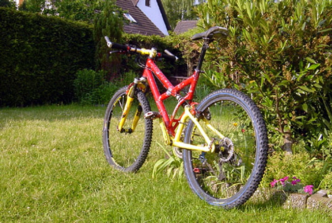 ...Hörnchen Alu-Eigenbau; Gelenkbolzen Eigenbau: Titan; Reifen Ritchey Z-Max WCSXT werfer front+back; Schalthebel Rapidf.+ Deore......