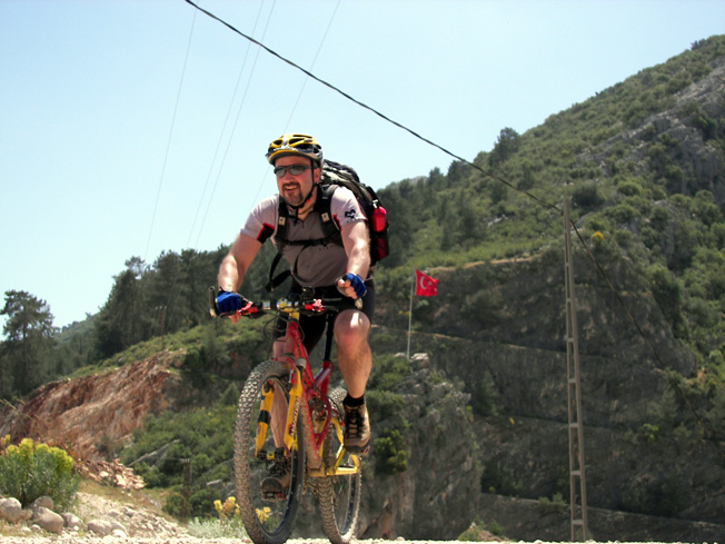 Am 24.04.2008 war es soweit. Alleine flog ich nach Antalya und wurde dort von Bernhard Brunauer von der Arykandos Mountainlodge empfangen. Den ersten Tag verbrachte ich in Antalya um mit Bernhard kurz hoch nach Geyikbayiri in das JoSiTo Camp zu fahren. Dort trafen wir etliche Kletterer und ich satrtete eine Kontrollfahrt meiner Tour 04, die neben einer kürzeren Trasse auch eine schöne Variante hervor brachte. Nachdem wir die ersten Gäste am Flughafen abgeholt hatten, ging es mit Bernhards Frau im Charterbus nach Gökbük, wo die Gruppe die Zimmer bezog. Später in der Nacht stiess noch ein Teilnehmer, der am Samstag anreisenden Gruppe, hinzu. Von der Lodge auf 204 Hm, über das beschauliche und urtümliche Dorf Gökbük ging es auf einigen km zunächst etwas bergab, dann bergan. Schon im nächsten Dorf endete der Asphalt und auf guter Schotterpiste gelangten wir durch ein Seitental in unser benachbartes Tal um nach kurzem steileren Anstieg wieder auf Asphalt zu stossen. Der Brunnen dort lieferte eine willkommene Erfrischung. Parallel der Asphaltstraße rollen wir auf einer Piste rasch nach Asarönü hinunter, einen schönen Steinbruch links im Bick. In Asarönü wartet Bernhard schon mit einer kleinen Mittagsverpflegung. Die Aussicht auf die Bucht ist herrlich. Am zweiten Tag, wir sind nun in voller Gruppenstärke von 8 Personen, geht es von der Unterkunft über einen unscheinbaren Forstweg zunächst bergan auf die Straße Elmali / Finike, die uns in rasanter fahrt hinunter in die Ebene leitet. Auf einer Nebenstraße rollen wir durch die Dörfer zum ersten Highlight: “Limyra”. Diese antike Siedlungsstätte begeistert die Gruppe. Viele Bilder werden gemacht und es geht weiter um den Felssporn herum, vorbei an einer der längsten erhaltenen römischen Brücken im Bereich der heutigen Türkei. Auch dies ist ein bemerkenswertes Bauwerk, trägt es doch such heute noch die Traktoren der Bauern, die die Brücke immer noch nutzen!! Sechs der acht Teilnehmer machten sich am nächsten Tag aufauf einen Singletrail zu befahren. Geplant war für den weiteren Tag eine Fahrt hoch auf die Felskante über dem Tal bei Gökbük, doch ein plötzlich heraufziehendes Wetter verhüllte alles oberhalb 1500 Hm in Wolken, so dass wir uns dazu entschlossen, die uns schon bekannte See-Tour in anderer Richtung zu fahren. Bernhard zeigte uns auch noch zwei sehr schöne Varianten, die ich auch noch nicht kannte. Mittag machten wir mit improvisiertem Grillen auf einer schönen Wiese. Am Fuß des Staudamms entdeckten wir, da unsere Blickrichtung nun 180° gedreht war, eine Tropfsteinhöhle, hoch oben in den Felsen. Der nächste Tag begann mit Sonnenschein. Vier meiner Mitstreiter hatten durch die tags zuvor unternommene Dolmusfahrt Mut gefasst und sich entschlossen in Finike in ein Hamam zu gehen. Zwei Biker und ich wollten angesichts der noch guten Wetterlage auf die nahe Felskante, auf 2000 Hm. Vom Pass weg ging es in nicht enden wollender aber guter Pistenfahrt hoch auf eine Alm. Leider jedoch änderte sich auch heute das Wetter im Laufe des Tages und die Wolkenbildung war nicht zu verleugnen. Gerade noch, dass wir unser Ziel, das Feuerbeobachtungshaus an der Felsabbruchkante sehen konnten und schon schloss sich die Wolkendeke gänzlich. Schade, denn der Blick auf unser Tal von hier oben wäre gigantisch. Zu allem gesellte sich nun auch noch ein Nieselregen, der teils in Graupel und später in Regen über ging. Von angenehmer Wärme fehlte natürlich nun ebenso jede Spur, so dass wir alle unsere Klamotten anzogen und dem Gipfel schnell wieder den Rücken kehrten. Die Abfahrt war wunderbar und trotz der Wetterlage hatten wir drei großen Spaß. An der breiten Schutt- und Geröllreisse habe ich dann die Abkürzung, direkt hinunter über die Geröllhalde genommen; ein genialer Ritt, der mich das Wetter vergessen hat lassen. Nun wieder gemeinsam fuhren wir am folgenden Tag eine schöne, große Runde. Zunächst auf Asphalt ging es auf kleiner, kaum befahrener Straße in einem Seitental moderat bergan. Die Landschaft ist malerisch und die auf der Hochebene wachsenden Weinstöcke rundeten das Bild hervorragend ab. Kaum hatten wir den Sattel erreicht, ging es auf einer guten Schotterpiste weiter bergan. Durch ein kleines Kar zog die Piste auf den Gebirgsstock. Nach der kräftezehrenden, langen Rampe tat sich plötzlich ein unbeschreiblicher Blick auf die umliegenden Gipfel und die Almebene auf, die unser Ziel für die Mittagspause war. Es wurde wieder, wie schon einmal, gegrillt. Viele leckere und gesunde Dinge hatte Bernhard für uns hergerichtet, viel besser, als sich nur von Müsliriegel zu stärken. Den letzten Tag verbrachten nur noch die vier Schwaben mit uns, denn die Salzburger (Wiener) reisten ja schon am Freitag an und eben diesen Freitag schon ab. Leider war die extravagante Woche nun vorbei. Die letzten Gäste reisten ab und auch ich packte meine Sachen. Da mein Flug später am Samstag ging, fuhr ich alleine mit dem Dolmus nach Antalya. Ich war zwar nicht überpünktlich, dafür hatte ich einen “privaten” Busservice und das einchequen ging fast von selbst, da ja die meisten Fluggäste schon “durch” waren......
