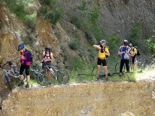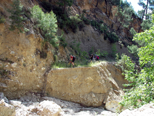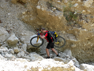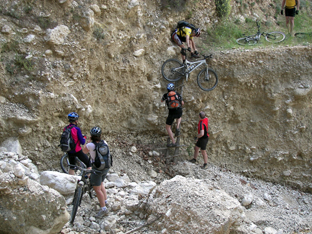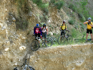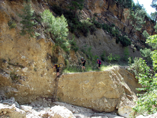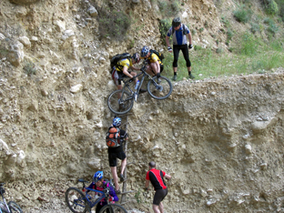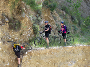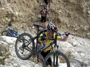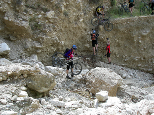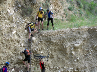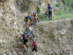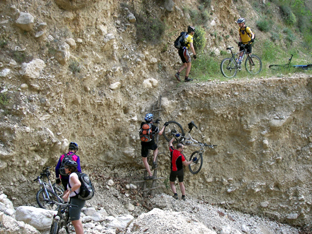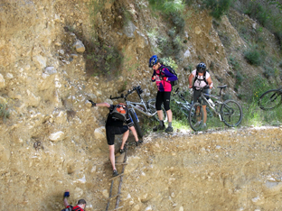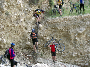 Auf der Piste (später Singletrail) am Höhenrücken, von Yalniz nach Arikanda hat ein Bach in einer Kehre die Piste abermals weggespült. Das war uns bekannt. Von offizieller Seite wird der Weg zzt. nicht mehr instand gesetzt, da zu erwarten ist, dass im nächsten Jahr alles wieder von vorne beginnt. Hirten haben eine abenteuerliche Leiter gezimmert, die für uns von großem Nutzen ist. Ein wenig wackelig ist das Ding schon, aber besser als nichts. Die Crew und ich, wir hatten großen Spaß. Besonders beeindruckend war die Ausgrabung von Arikanda; doch dazu später mehr!